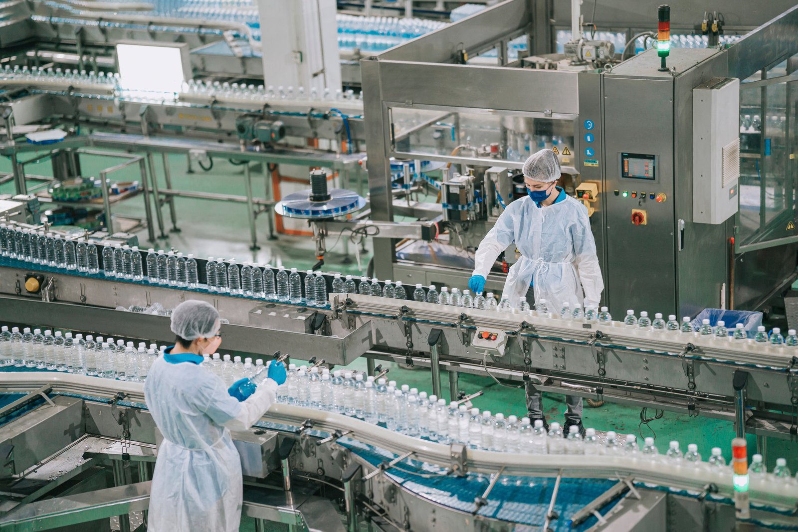 2 Asian Chinese drinking water factory production line workers with PPE examining water bottle working in daily routine | Ergomais