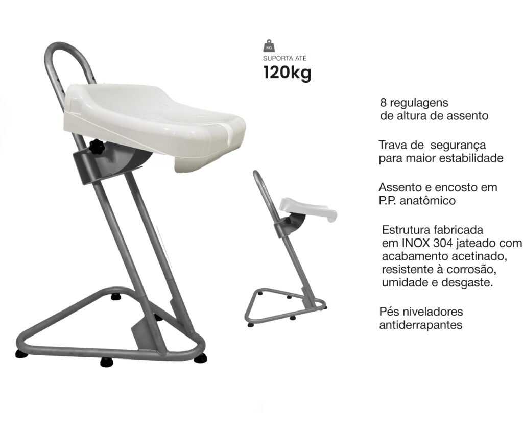 O Banco Ergonômico Semi Sentado Inox Assento P.P possui estrutura 100% em inox jateado com acabamento acetinado, resistente à corrosão e ideal para ambientes úmidos ou sujeitos à limpeza constante. O assento em P.P. anatômico garante conforto térmico e fácil higienização.