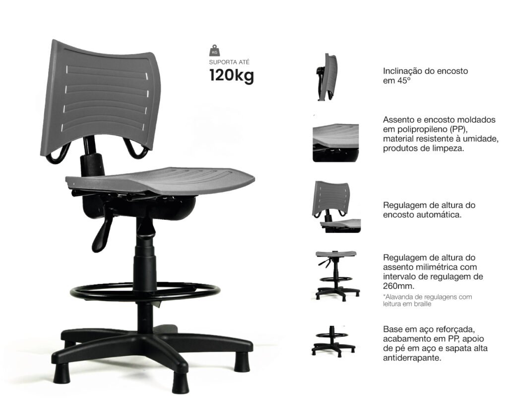 Indicada para manipulação de produtos, inspeções, análises e processos produtivos contínuos, a cadeira oferece uma solução prática para ambientes que exigem mobiliário resistente, leve e de fácil limpeza.