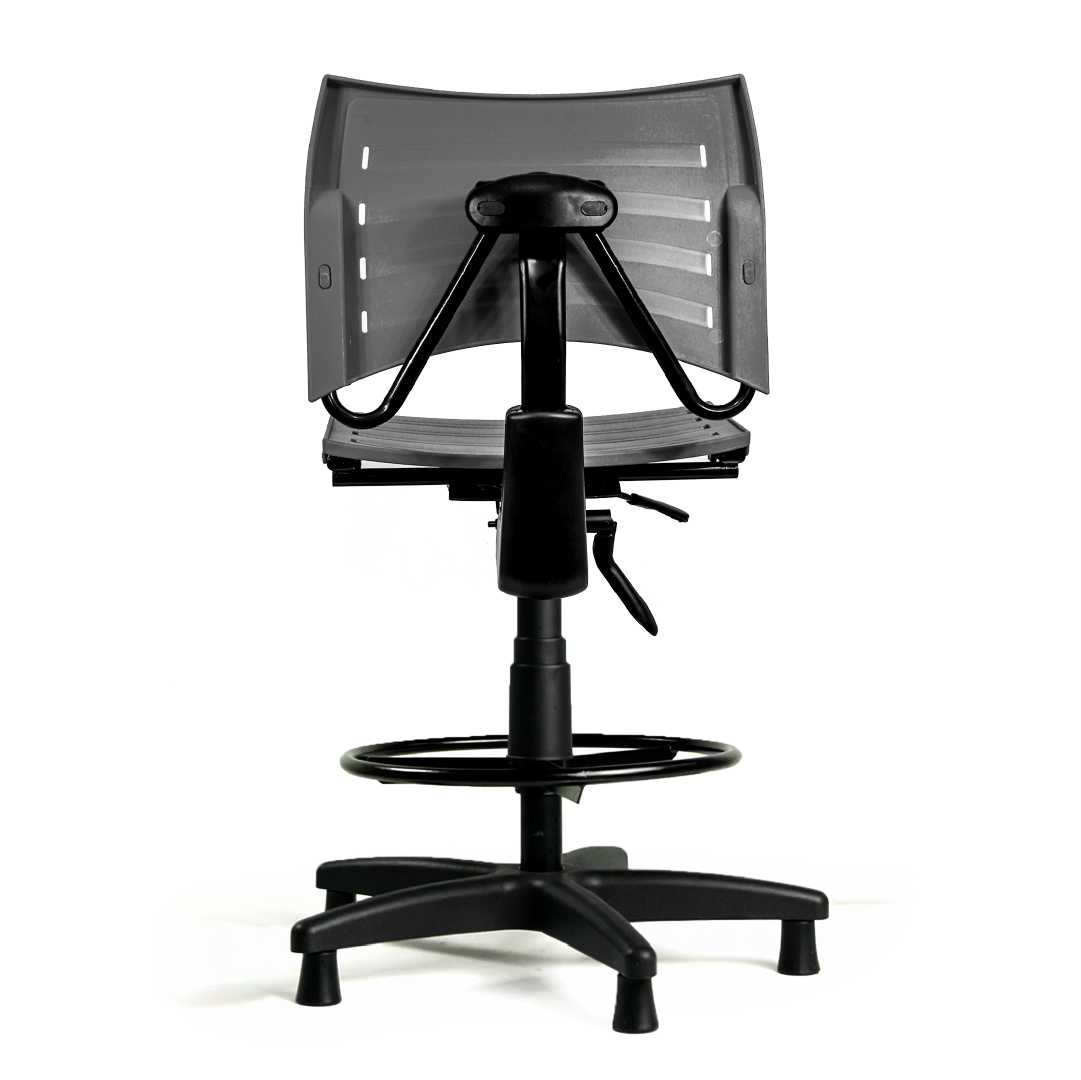 O assento e o encosto em polipropileno (PP) não absorvem líquidos e permitem limpeza frequente sem comprometer o material. Por esse motivo, a cadeira é indicada para setores alimentícios, indústria farmacêutica, salas limpas e áreas de controle de qualidade.