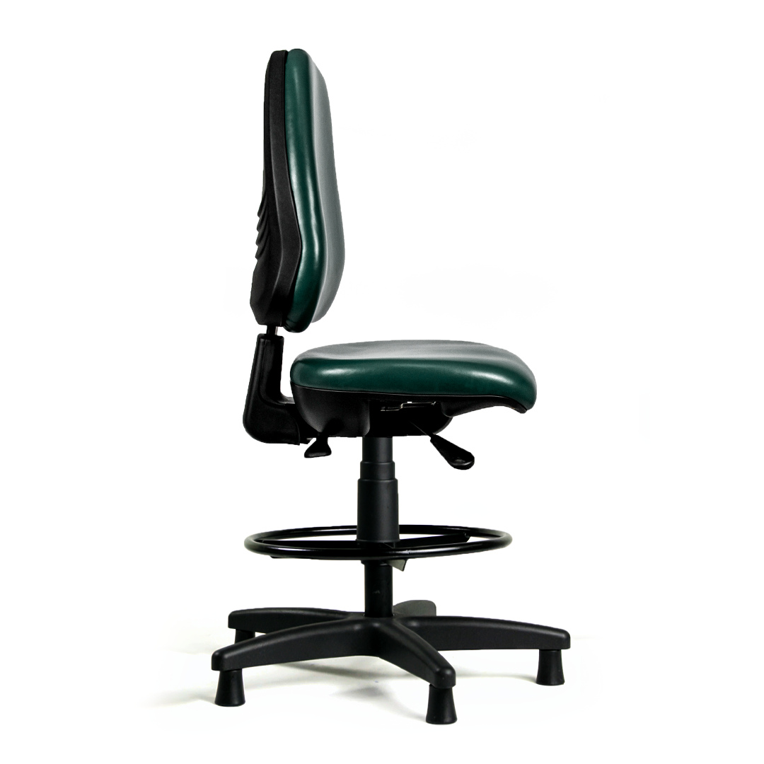 A Cadeira Ergonômica Industrial Stylus Alta possui assento e encosto em espuma injetada de poliuretano de alta densidade, revestidos em tecido poliéster ou courvin vinílico resistente à limpeza frequente e ao desgaste industrial. A estrutura interna reforçada garante longa vida útil em ambientes fabris.