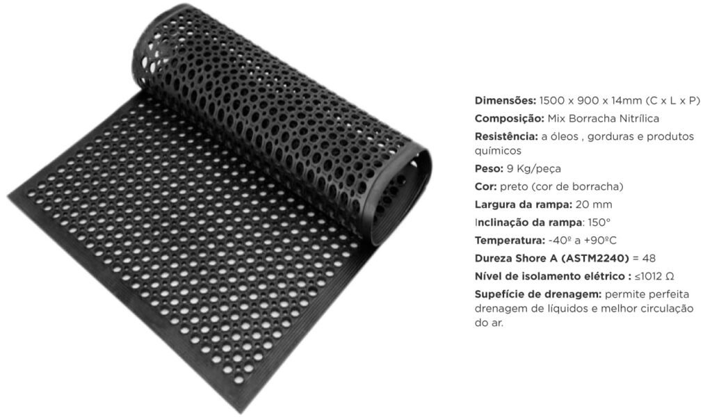 O design com superfície drenante facilita o escoamento de líquidos e melhora a circulação do ar. Assim, o tapete mantém boa aderência mesmo em ambientes úmidos ou com presença de óleos.